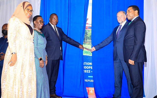 Makamu wa Rais wa Jamhuri ya Muungano wa Tanzania Mheshimiwa Dkt. Philip Mpango akizindua Mpango wa Tatu wa Maendeleo wa Miaka Mitano (2022-2027) wa ushirikiano baina ya Tanzania na Ofisi ya Mrati . . .