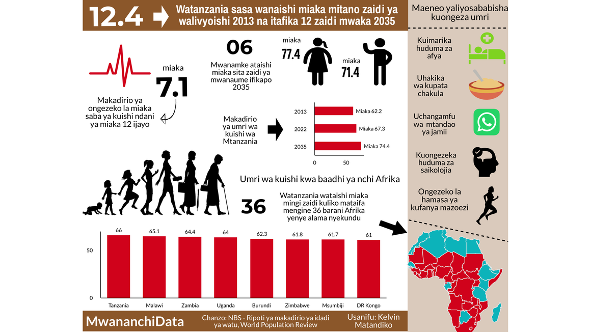 Makadirio ya ukomo wa umri wa kuishi kwa Watanzania yameongezeka kutoka miaka 67 na miezi mitatu mwaka huu hadi kufikia ukomo wa miaka 74 ifikapo 2035, ikiwa ni ongezeko la miaka saba na miezi miw . . .